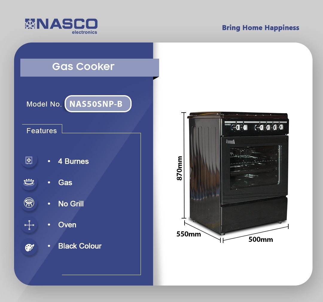The Nasco NAS50SNP-B 4-Burner Gas Cooker combines dependable cooking performance with sleek black styling in a perfectly sized 50cm format. Featuring four gas burners, a spacious gas oven, automatic ignition, and flame failure safety devices, this freestanding cooker delivers everything you need for daily family cooking with reliability and efficiency.